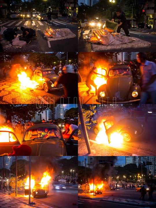 Num texto que acompanha as fotos, está dito, em maiúsculas: “Nenhum manifestante ateou fogo no carro.” Nesta versão, as pessoas por perto acabaram tirando do Fusca uma mulher e uma criança que estavam no banco de trás.