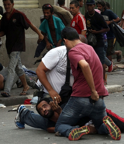 Dez carros da Civil cercaram o local, fecharam dois quarteirões e começaram a lançar bombas de efeito moral. Cinco pessoas foram detidas. A pancadaria durou perto de 20 minutos, meia hora. Correria, gente pisoteada, o caos.