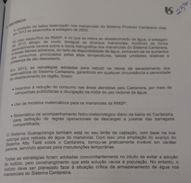 “O Plano de Contingência II está, então, evitando que a população seja submetida ao rodízio e aos malefícios correspondentes à sua implementação, cujos mais impactantes são os riscos à saúde pública devido às pressões negativas às quais as redes ficam submetidas”. O documento conclui que, além da diminuição da qualidade da água, o corte no fornecimento mobilizaria um contingente grande de mão de obra que a Sabesp deveria evitar para investir na melhoria da infraestrutura.