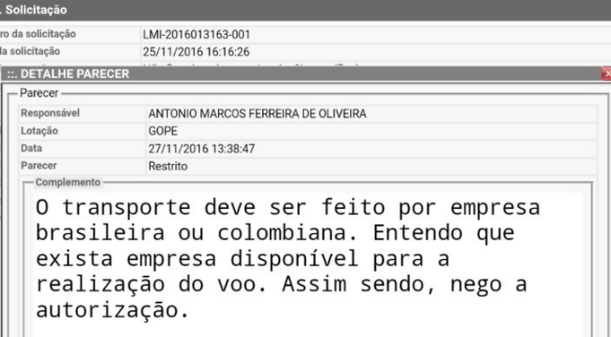 Brasil ou da Colômbia; com esse imprevisto, a mudança foi feita às pressas e a aeronave se
