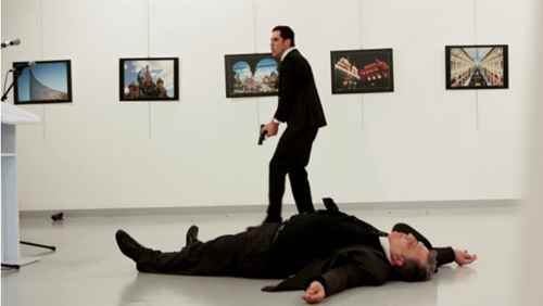 Uma variação da foto acima, do assassinato do embaixador russo na Turquia, está hoje nas primeiras páginas do Estado e da Folha de São Paulo, do Globo e também do Valor, mas não é manchete em nenhuma delas.