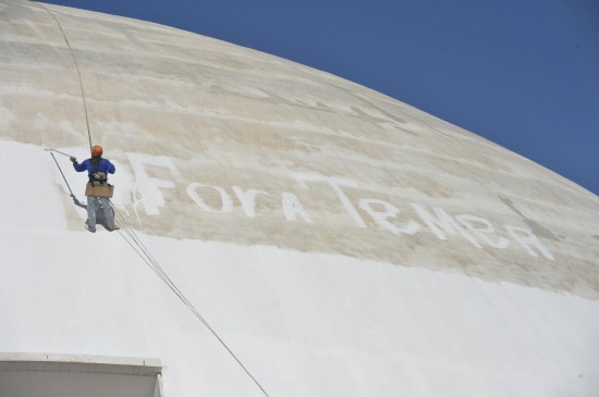 Temer” na fachada do Museu Nacional, nesta quarta-feira (05/04), enquanto trabalhava na
