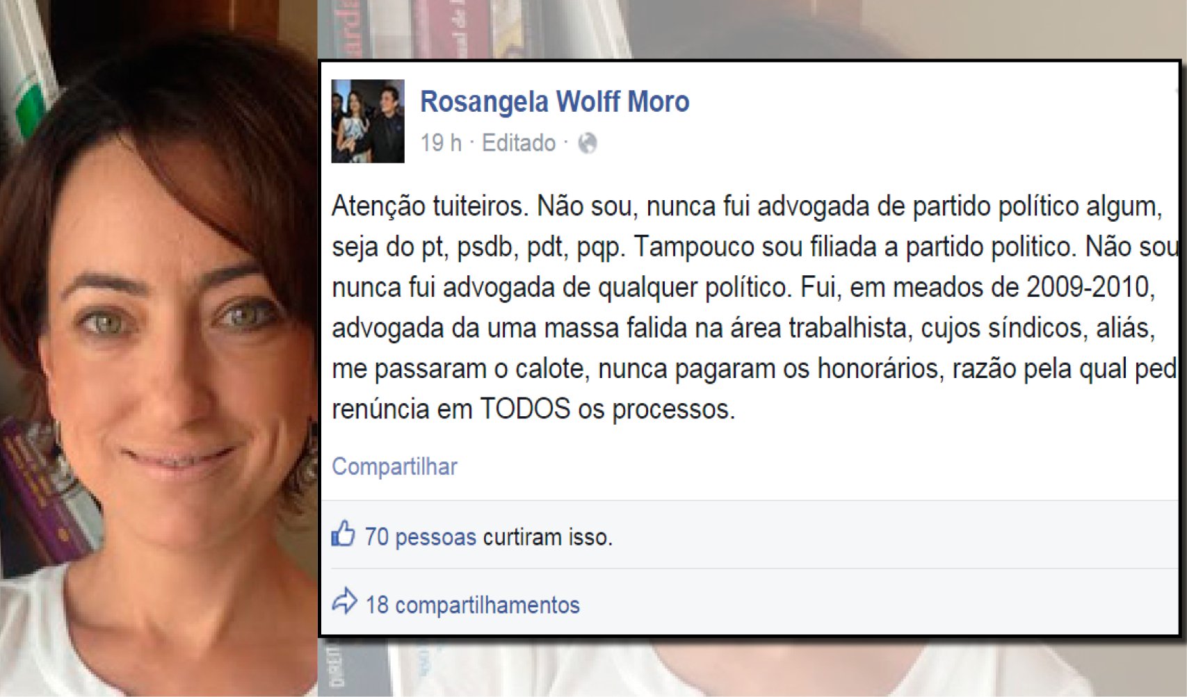 Em 2015, quando foram divulgadas por blogs uma suposta ligação de Rosângela Moro com o PSDB, ela foi ao Twitter para dizer, em mais de um post:
