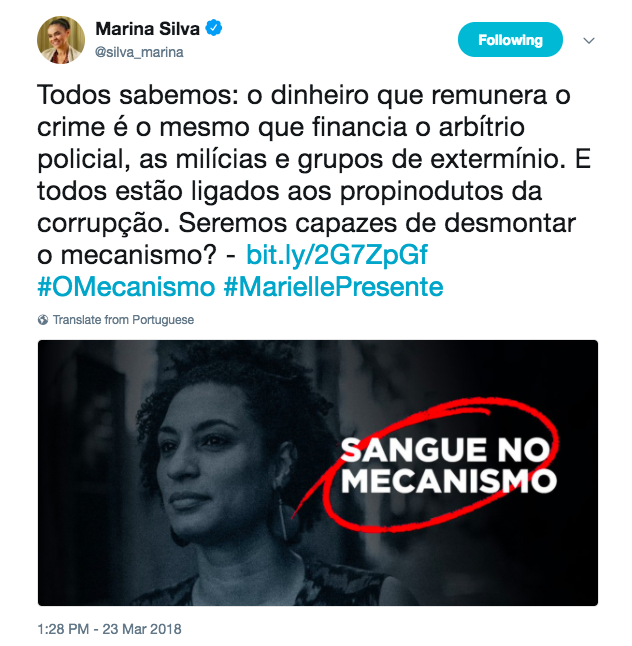 “As causas de Marielle são lutas contra o mecanismo, pois todos sabemos: o dinheiro que remunera