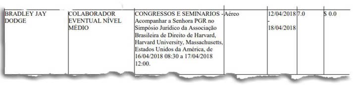 Segundo o boletim administrativo do Ministério Público Federal, a instituição pagou sete diárias para Dodge, bem como suas passagens aéreas, constando a saída do Brasil no dia 12, uma quinta-feira, e a volta no dia 18, uma quarta.