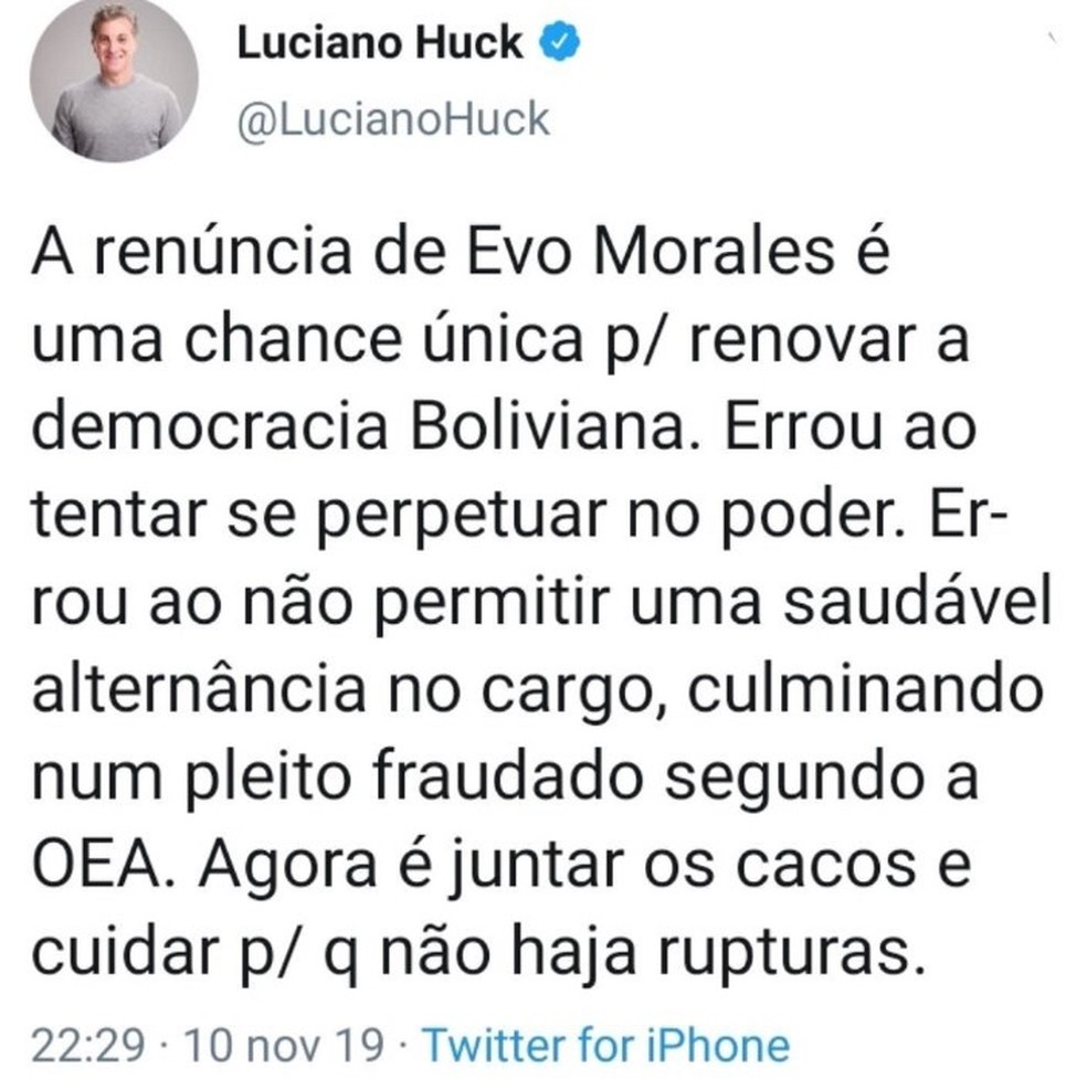 Huck, então, apagou o post e postou: “Espero q a Bolivia, restabeleça a sua democracia;